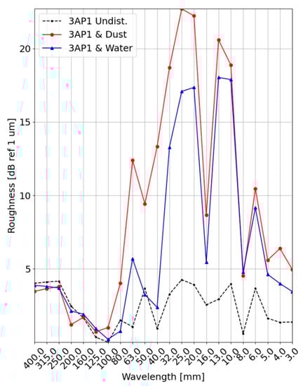 The absolute error of the acoustic roughness for measurements with dust and alternatively water on the rail surface along with the absolute error of an undisturbed measurement are shown in Figure 6. In the wavelength range below , both disturbed scenarios show significant deviations compared to the undisturbed measurement and the reference. The measurement with dust on the rail deviates from the reference by a maximum of , at a wavelength of . The measurement with water on the rail deviates from the reference by a maximum of , at a wavelength of .