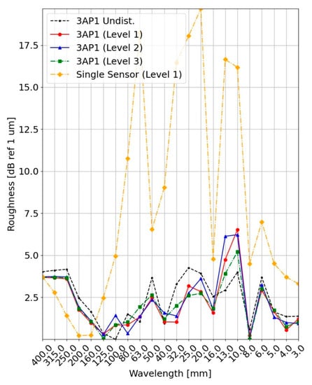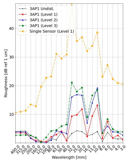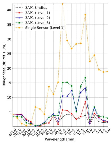 Three different displacement amplitudes are tested, as well as tilt amplitudes of the sensor plate. The resulting absolute error of the acoustic roughness for measurements with a displacement of the sensor plate are shown in Figure 7. The acoustic roughness determined for the single sensor already shows a large deviation from the reference for the smallest displacement amplitude (referred to as level 1), leading to an average deviation of . In the wavelength range between and , the chord method shows the largest deviations for all displacement amplitudes, with the mean deviation increasing from over to for increasing displacement amplitudes (levels).