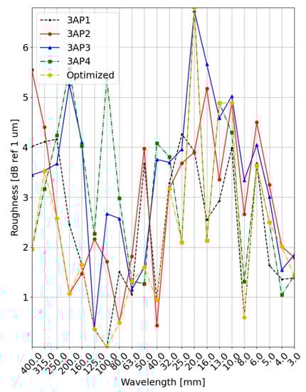 For each one-third octave band, the minimal is included (column-wise in ) and added up for all bands. The configuration with the lowest resulted in the specified sensor distances listed in Table 1. The four chords are used to achieve a subsequent optimization of the measurement result. For each one-third octave band, the measured value of the chord with the lowest value is used and included into the spectrum of acoustic roughness. This procedure is subsequently referred to as optimized acoustic roughness.