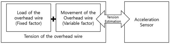 The tension of the overhead wire is generated by the force produced by the load of the overhead wire itself and the force produced by the movement of the overhead wire by wind, etc. In the case of a force due to a load on the overhead wire itself, it can be considered as a fixed factor. On the other hand, force produced by the movement of the overhead wire should be considered as a variable that varies due to various factors. In other words, if the movement of the overhead wire is quantified, the tension of it can be estimated. The movement of an overhead wire can be intuitively quantified using acceleration sensors, and if the relationship between the data of the acceleration sensors and the tension of the overhead wire can be derived, the tension of the overhead wire can be estimated. The theoretical background of this study is schematized in Figure 1 below.