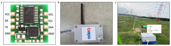 (a) WT61 module. (b) Utilized acceleration sensor in KEPCO. (c) Example of installed acceleration sensor in KEPCO.