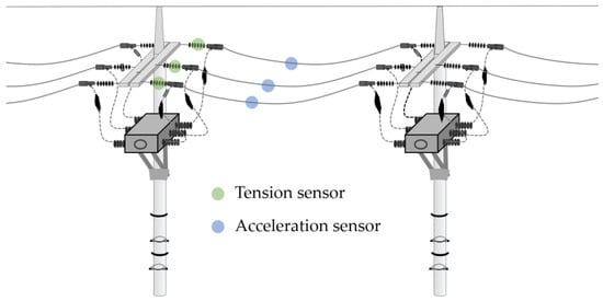 As repeatedly described above, in this study, acceleration sensors were attached to existing overhead wires and utilized to estimate their tension. Moreover, in the case of the acceleration sensor, they were installed to be located in the middle of the wires as much as possible. A schematic diagram of the installation location and an actual installation example are shown in the Figure 2 below.