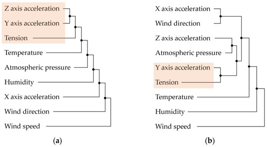 In order to derive the relationship between acceleration sensor data and the tension of the overhead wires, integrated data were constructed on the basis of the measured data from heterogeneous sensors. In the end, the tension of the overhead wire was derived using only the data of the acceleration sensor, but for the purpose of comparative verification, the tension measurement sensor was installed separately. In addition, the data measured by the acceleration sensor and the tension sensor were analyzed after time synchronization. For the correlation analysis of data, third-order differencing data through DWT was used, and important factors were selected by performing Pearson’s correlation and clustering-based similarity analysis. The Pearson’s correlation coefficient was calculated on the basis of Equation (2) below, and the results of Pearson correlation analysis from 3 September 2021 to 29 September 2021 are shown in Table 2. As a result of the analysis, it may be seen that in the case of Pearson’s correlation analysis, the tension and the Y-axis acceleration have the highest correlation.