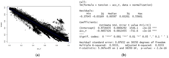 (a) Diagram between the tension and Y-axis acceleration data. (b) Result of the linear regression analysis using R.