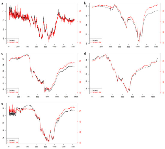 Estimated vs. actual tension of overhead wire: (a) 7 September 2021; (b) 10 September 2021; (c) 13 September 2021; (d) 16 September 2021; (e) 21 September 2021.
