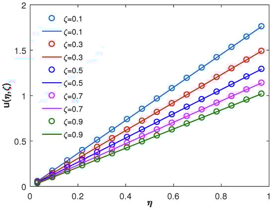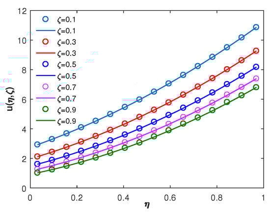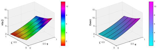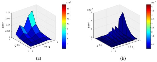 The comparison of the exact solution and the approximate solution for and is depicted in Figure 1 and Figure 2, respectively. From Figure 3, the absolute error for and is represented via three-dimensional plots, from which we infer that as we increase the wavelet parameters k and M, the absolute error decreases. To show the legitimacy of the proposed method, we compare the obtained absolute error with the absolute error of the trigonometric B-spline [] and the Haar wavelet methods [] in Table 1, Table 2 and Table 3 for different values of ζ, from which one can easily infer that the results achieved through the Fibonacci wavelets are reasonably effective in comparison to the other existing numerical methods.