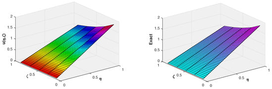 Figure 4 and Figure 5 depict the graphical comparison of the proposed method with the exact solution for and , respectively, which suggests that the Fibonacci wavelets are in good agreement with the analytic solution of the problem. Moreover, in Figure 6, the absolute error for different and is shown via a three-dimensional plot, which elucidates that, upon increasing the wavelet parameters k and M, the absolute error decreases. Finally, a comparison of the absolute error of the proposed method with the trigonometric B-spline [] and the Laguerre wavelet methods [] is given in Table 4, Table 5 and Table 6 for different values of ζ. From these tables, we conclude that the proposed method is more accurate than the other existing numerical methods.