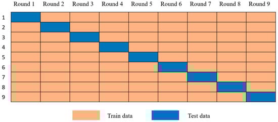 Following data processing, the model was trained and tested using the leave-one-out cross-validation technique [16]. Briefly, one data sample in the dataset was taken as an assessment set (i.e., a testing set), and all the other data samples were taken as a training set. The process was repeated until every data sample in the dataset had been taken as the assessment set once. As shown in Table 2, the Taguchi DOE design involved nine experimental runs. In other words, the Taguchi experiments generated nine data samples, with each sample consisting of the values assigned to the four machining parameters and the corresponding machining precision. Accordingly, the leave-one-out procedure was repeated nine times, as shown in Figure 4, with the prediction accuracy calculated each time.