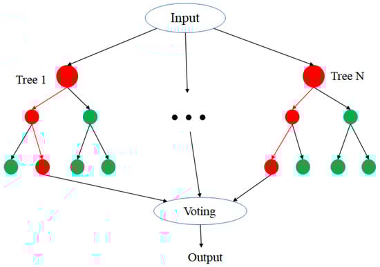 Random forest (RF) [17] combines the strengths of the bagging and decision tree algorithms, as shown in Figure 5. Bagging is used first to generate randomly distributed training data, and this data is then randomly assigned to multiple decision trees for training purposes. Since each decision tree uses different training data, each trained decision tree is different from the others. The weight of each decision tree is thus obtained via majority voting. As the training and testing process proceeds, the weaker decision trees are gradually combined to construct a stronger model with a better prediction performance.