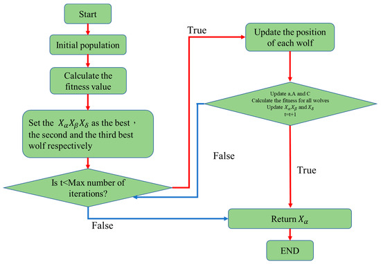 The grey wolf (GW) optimizer [23] is an intelligent optimization algorithm that mimics the group hunting behavior of grey wolves, and involves three main steps, namely, establishing hierarchy, encircling, and attacking. As shown in Figure 10, three solutions (alpha, beta, and delta) are first selected as the best solutions among the initial population. In each iteration, the position of the prey (i.e., the optimal solution) is updated according to the positions of these wolves, based on