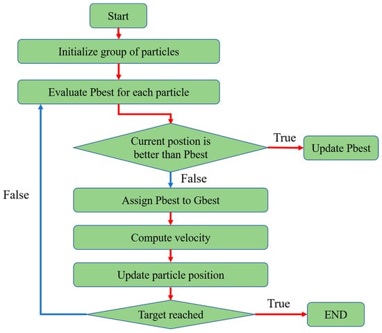 where is the velocity of individual i in the k-th iteration, is the weight, and are the acceleration constants, and and are random values in the interval [0, 1]. In addition, is the position of individual i in the k-th iteration, is the best position of individual i in each iteration, and is the best solution in the entire domain.