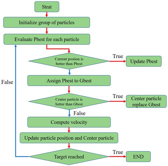 Center particle swarm optimization (CPSO) [25] is an extension of the PSO algorithm, and aims to reach the optimal solution more rapidly through the introduction of a center particle located in the middle of all the particles in the swarm (see Figure 12). The rationale for this approach lies in the fact that the center of the personal best solutions of all the particles is located closer to the best solution than the global best solution. Thus, in the CPSO algorithm, the position of the center particle is taken in place of the global best position in the original PSO algorithm in order to improve the convergence speed. The position of the center particle is computed as