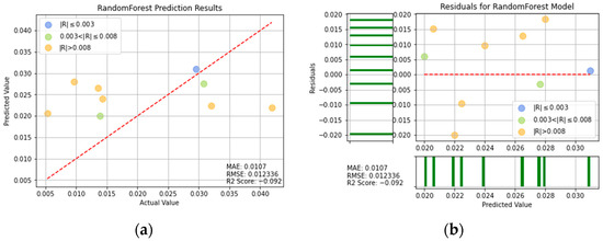RF prediction results: (a) comparison of actual and predicted precision values, and (b) residual plot.