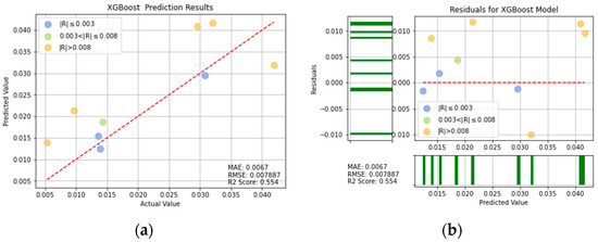 XGBoost prediction results: (a) comparison of actual and predicted precision values, and (b) residual plot.