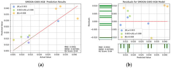 SMOGN-GW-XGB prediction results: (a) comparison of actual and predicted precision values, and (b) residual plot.