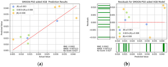 SMOGN-PSO-XGB prediction results: (a) comparison of actual and predicted precision values, and (b) residual plot.