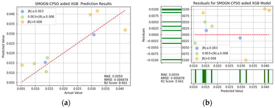 SMOGN-CPSO-XGB prediction results: (a) comparison of actual and predicted precision values, and (b) residual plot.