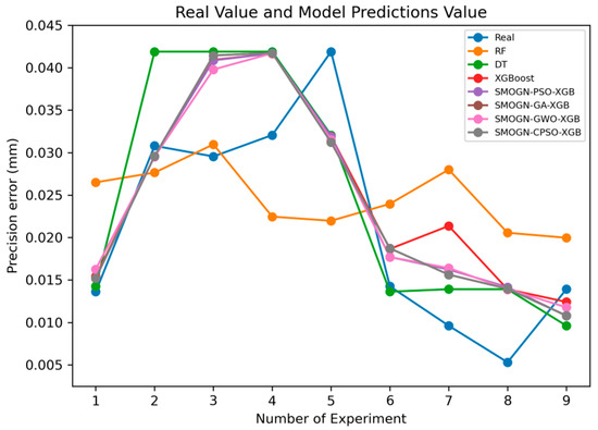 Figure 23 compares the predicted machining errors of the seven models with the actual machining error for each of the nine runs in the Taguchi OA. Overall, the results show that the SMOGN-CPSO-XGB model and SMOGN-GWO-XGB model yield the best fits with the actual prediction error in each run. By contrast, the RF model yields the poorest fit with the experimental data.