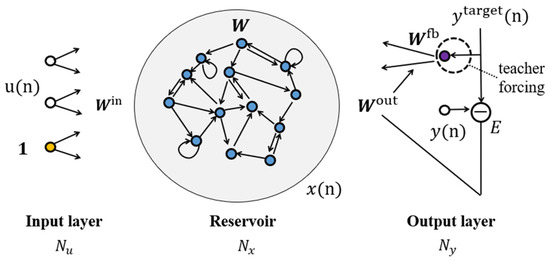 In the training process of an ESN, the weight, and are randomly generated through a uniform distribution and remain unchanged after initialization. The weight matrix is obtained by offline learning. Since the output of an ESN model is linear and forward, Equation (4) can be further written as