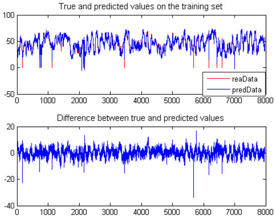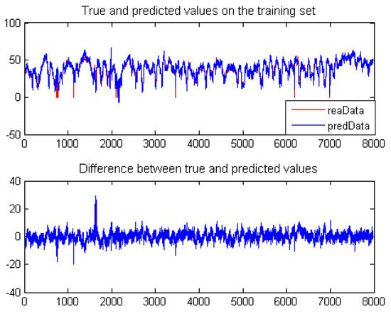 Figure 5 shows the true and predicted values on the training set as well as the prediction error. Similarly, the x-axis represents the time index and the y-axis denotes the pitch motor temperature. The training data are all generated during the normal operation of the turbine. It can be seen from Figure 5 that the prediction error is basically between −10 °C and 10 °C.