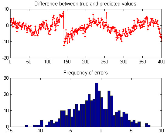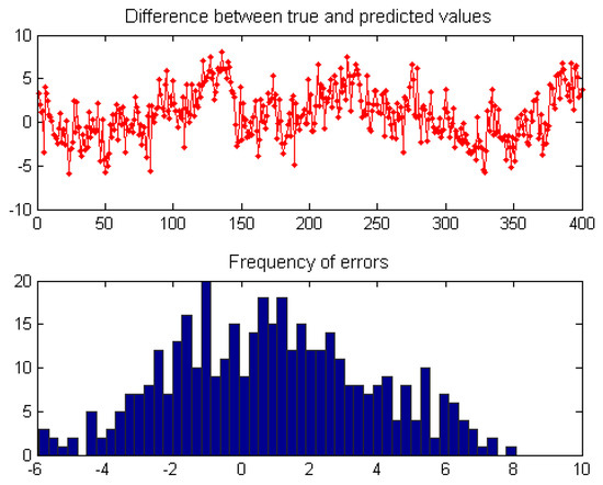 Furthermore, Figure 3 shows the performance of the model on the test set. The upper subplot illustrates the prediction error, and the lower subplot depicts the error frequency. It can be seen from Figure 3 that the prediction error of the model is concentrated between −6 °C and 6 °C, with an RMSE of 3.0186 and the corresponding MAPE of 5.5088. Overall, the ESN model performs well on the test data.