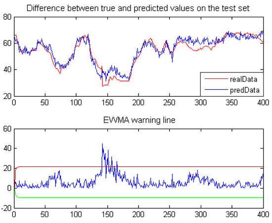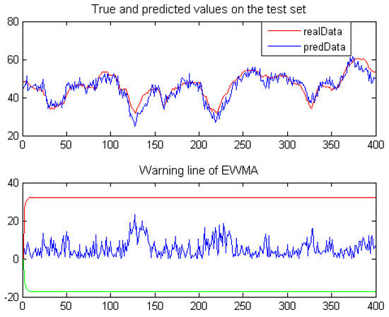 In order to achieve status monitoring, the EWMA method was adopted to calculate the upper and lower bounds of pitch motor temperature. Figure 4 shows the experimental results of the test set. In addition, the corresponding EWMA warning lines were also plotted, in which the red and green curves represent the upper and lower warning bounds, respectively. Notice that the wind turbine is in a normal state on the test data set, hence there is no alarm, and the experimental results are consistent with the expectation.