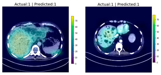 After reaching an accuracy of 95.89%, the training was stopped, and the Grad-CAM method was applied for each of the test images, including those that were falsely classified. The following figure, Figure 6, shows some of the CT images with their associated heat-maps overlaid. In the legends of the figures, “Actual” shows the label for DeepLesion, and “Predicted” shows the output of the CNN classifier.