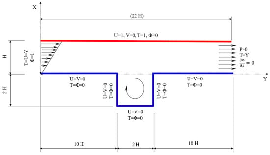 The dimensionless boundary conditions for the velocity, temperature, and concentration fields are reported in Figure 1. In Equations (14)–(23) the following dimensionless groups have been used:
