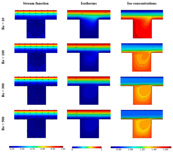 Let us now discuss the main features of the solutions of Equations (14)–(23). In Figure 3, Figure 4, Figure 5 and Figure 6, the velocity field stream function, the isotherms, and iso-concentration lines are reported for Pr = 6.2 and by considering the variation of one parameter (Re, Le, NB, or NT) while the other ones, respectively, are (100, 0, 0.1, 0.1).