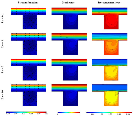 Figure 4 refers to different values of the Lewis number and shows that for increasing values of Le the concentration vortex tends to occupy the whole cavity. Also, with reference to the channel region, for increasing values of the Lewis number, the concentration gradients tend to move close to the channel walls.