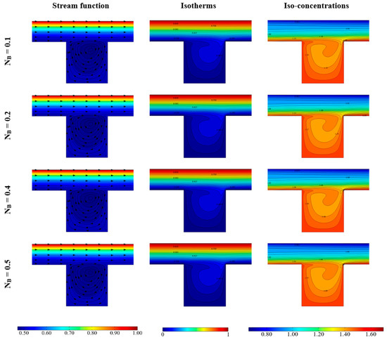 Stream function, Isotherms and Iso-concentration for various NB number and Pr = 6.2, Re = 100, Le = 1, NT = 0.1.