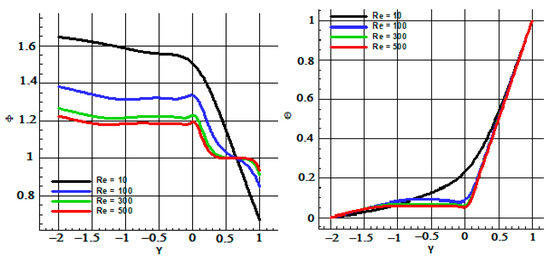Concentration and temperature for different Re number and Pr = 6.2, Le = 1, NB = NT = 0.1.
