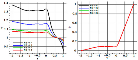 In Figure 10, the dependence of the concentration and temperature fields on the Brownian diffusivity coefficient NB are reported, showing that smaller values of NB yield higher concentrations and to less uniform behavior of this function. On the contrary, NB does not affect the trend of the dimensionless temperature.
