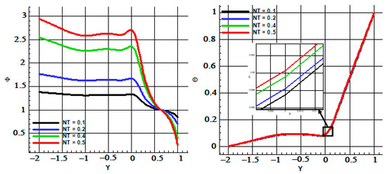 Figure 5 refers to different values of the Brownian diffusivity coefficient, showing that the solution is not strongly affected by this parameter: in fact, slight differences appear not only in the stream function distribution but also in the temperature and in the concentration distribution. Finally, Figure 6 refers to different values of the thermophoretic diffusivity coefficient NT, showing that also this parameter does not strongly affect the obtained solution.