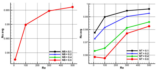 Average Nusselt number as a function of Re number for different NB number and Pr = 6.2, Le = 1, NT = 0.1 (left); Average Nusselt number as a function of Re number for different NT number and Pr = 6.2, Le = 1, NB = 0.1 (right).