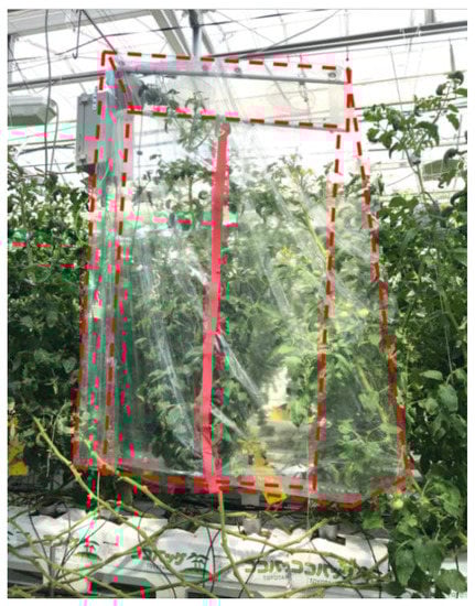 The new chamber is shaped vertically because it is intended to completely cover plants, such as tomatoes. Shimomoto et al. [15] successfully tracked the time courses of tomato plants, the net photosynthetic rate, transpiration rate, and total conductance inside a monitoring system using a similar chamber. However, since measurement was conducted only for the photosynthetic rate and related environmental factors, the CO2 distribution in the chamber was not well known.