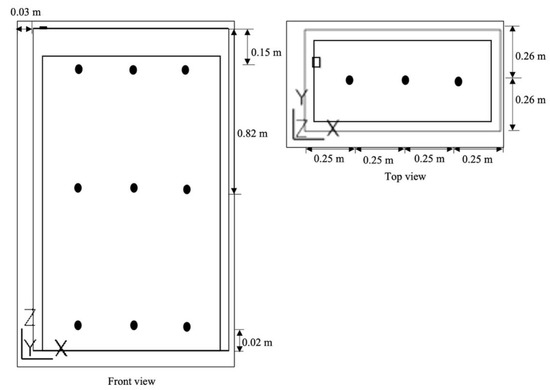 The experiment was conducted in a chamber inside the greenhouse with a CO2 concentration of approximately 420 ppm. The chamber is a semi closed hanging type that is 1 m in length, 0.52 m in width, 1.64 m in height, and an area of the bottom opening: 0.52 m2 (1 m in length × 0.52 m in width) (Figure 1). The air inside the chamber flows out through an exhaust fan (9BMB24P2H01, Sanyo Denki, Philippines) at the left ceiling of the chamber. The air velocity of the fan is 18.7 m s−1, applied to determine the volumetric flow rate of the fan in this research and used in the simulation as shown below (Equation (1)):