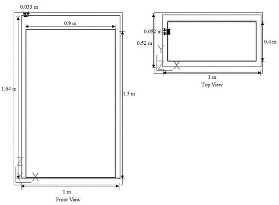 The chamber model replicated the bottom open chamber. A similar chamber has been used to investigate photosynthetic rate, related environmental factors [15], and airflow uniformity [30]. Chamber dimensions of length, width, and height were 1, 0.52, and 1.64 m, respectively (Figure 4). In the calculation of chamber simulation, the scale of the domain was small and consisted of two plants and one fan as outlet and inlet at the bottom part of the chamber.