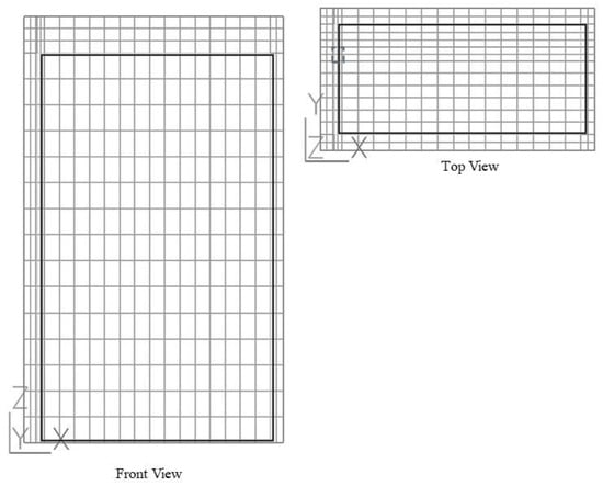 Meshing of chamber model: the dashed line square at top view represents fan (