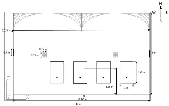 The computational model greenhouse has dimensions of length 12 m, width 10 m, and height 6 m. The greenhouse model has four circulating fans, four shelves of cultivating bed for tomato, and four CO2 perforated tubes on each shelf (Figure 6). Leakage paths were managed in the door area and for tiny gaps across the greenhouse rib structure between the wall and the roof [31].