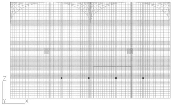 The greenhouse simulation was conducted and compared with the measurement data of CO2 enrichment. Model validation calculated the CO2 distribution from CO2 perforated tubes in the whole greenhouse. The number of meshes in the computational domain had 739,350 cells inside the greenhouse (Figure 7). The simulation model’s accuracy was assessed using RMSE and MAPE by comparing the percentage errors of each measured and simulated point. Table 2 presents the computational conditions used for the three-dimensional CFD simulation.