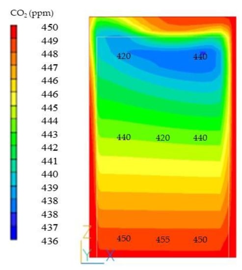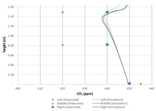 The measured CO2 concentrations were compared with the simulated CO2 distribution inside the chamber. Model simulation accuracy was evaluated by comparing each measured and simulated point’s percentage errors of Table 3. The MAPE of the left, middle, and right parts of the chamber were 1.85%, 3.43%, and 0.43%, respectively, and the RMSE of left, middle, and right parts were 11.20, 16.99, and 2.17 ppm, respectively, according to the CFD model for CO2 distribution.
