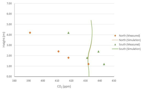 CO2 concentration of measurement (north ♦ and south ▲) and simulation (north and south ─) data according to the position from the ground.