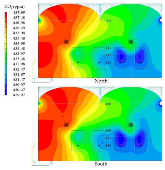 According to the results of the CO2 distribution using the CFD model within the greenhouse, the MAPE of north and south were 4.95% and 2.04%, respectively, whereas the RMSE of north and south were 25.33 and 10.57 ppm, respectively, compared with the measured values. However, the simulation results in this study may be reasonable to predict the CO2 distribution considering CO2 absorption through the process of photosynthesis of the plant inside the greenhouse (Figure 11).