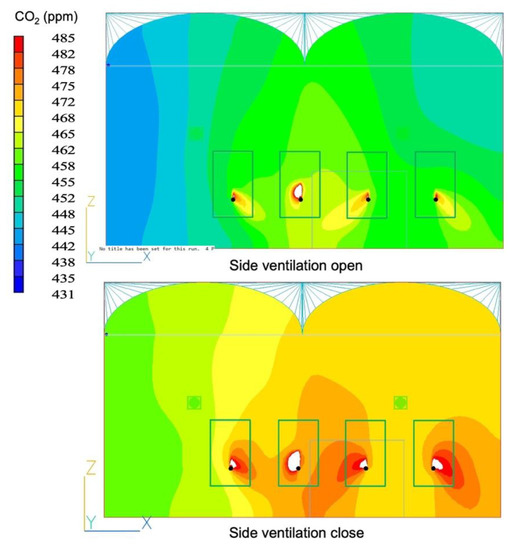 The CO2 distribution inside of the greenhouse in case the side ventilations open and closed (image taken at cross-section 6 m from south wall).