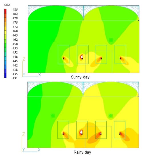 There was a minor change in the CO2 concentration between sunny and rainy days, according to the CO2 distribution (Figure 13). The effects of solar radiation on CO2 distribution were slightly significant. The case of rainy day showed a slightly more even of CO2 distribution inside the greenhouse than the case of sunny day. For the entire greenhouse, the quantitative evaluation of these results using CV shown in Table 6 is 18.1% for the sunny-day case and 15.6% for the rainy-day case. However, when it comes to the variability of CO2 concentration inside the plant, sunny day (8.1%) and rainy day (8.7%) had essentially no effect on even the fluctuation of CO2 concentration in the plant canopy.
