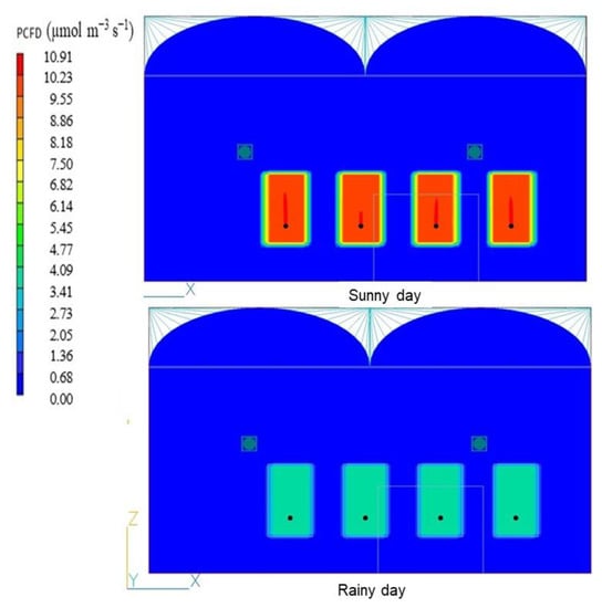 Simulations under treatment of 1000 ppm of CO2 concentration, that had been done in the previous study [34,35] were conducted on a rainy day condition with PAR of 95 W m−2 [36] and sunny day condition with PAR of 355 W m−2 (based on NEDO solar radiation database).