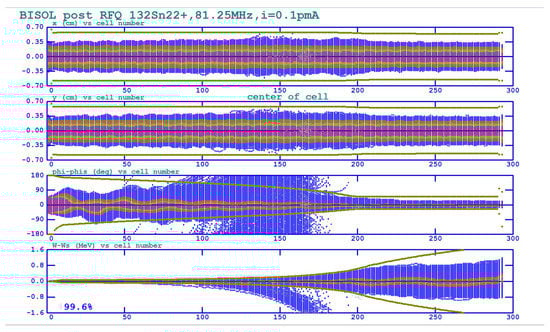 The design parameters of the post RFQ are summarized in Table 1.  is taken as the reference particle, the input transverse normalized rms emittance is 0.25 mm·mrad, and the peak beam current is 2.2 emA. According to the Kilpatrick criterion Equation (1) []: