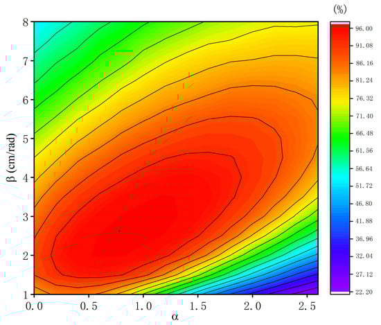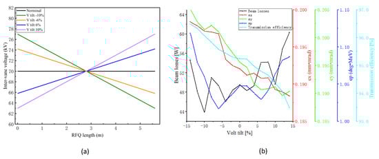 There are two types of inter-vane voltage errors in our study. The first one is the tilt of the voltage, as shown in Figure 6a. A negative tilt means a higher value of voltage than the design value at the beginning of RFQ. As shown in Figure 6b, there is no significant reduction in the transmission efficiency at +5% voltage tilt; a positive tilt will increase the beam losses because focusing on strength is not enough, so the transmission efficiency will gradually decrease with the increase in positive voltage tilt percentage, but the power of the beam loss is related to the number of lost particles and its energy at the time of loss, so it is not simply a gradual increase in the process. The second perturbation is the residual voltage error, as shown in Figure 7a, the magnitude of which is generated by introducing higher order harmonics, as shown in Equation (2)