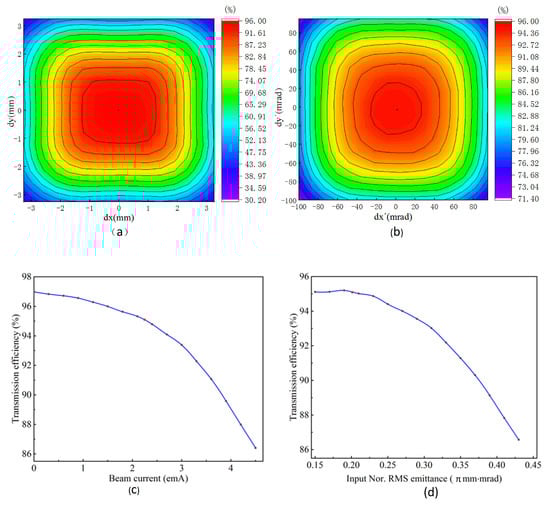 Figure 4 shows the influence of the input offset and tilt, beam current, and input-normalized rms emittance of RFQ on transmission efficiency. When the beam current is less than 2.5 emA, and the input-normalized rms emittance is less than 0.42 mm·mrad, the transmission efficiency of RFQ is greater than 95%. In order to reduce the beam losses caused by the beam collimation error at the entrance, the beam transverse offset and tilt error should be within ±1 mm and ±25 mrad, respectively.